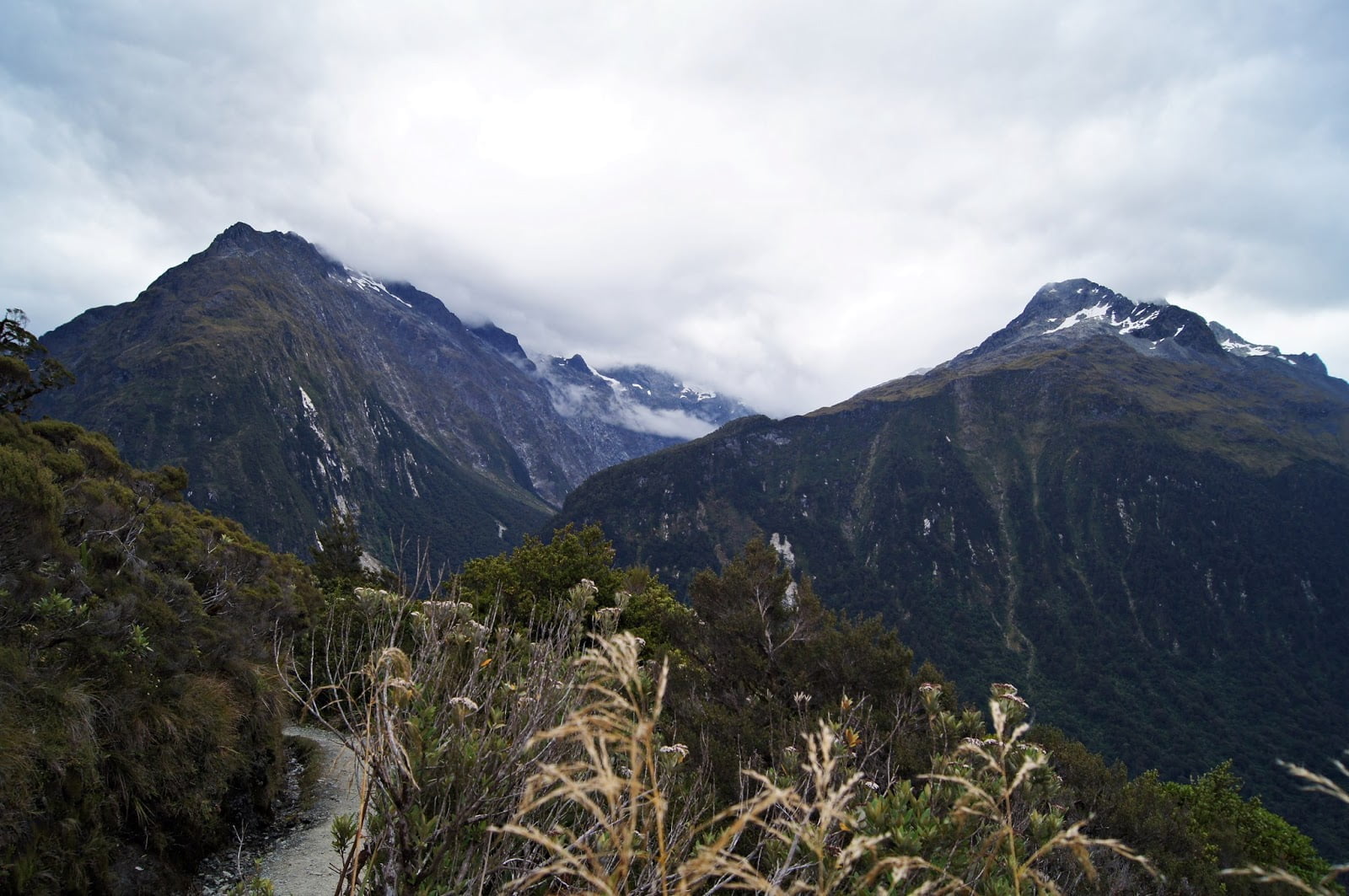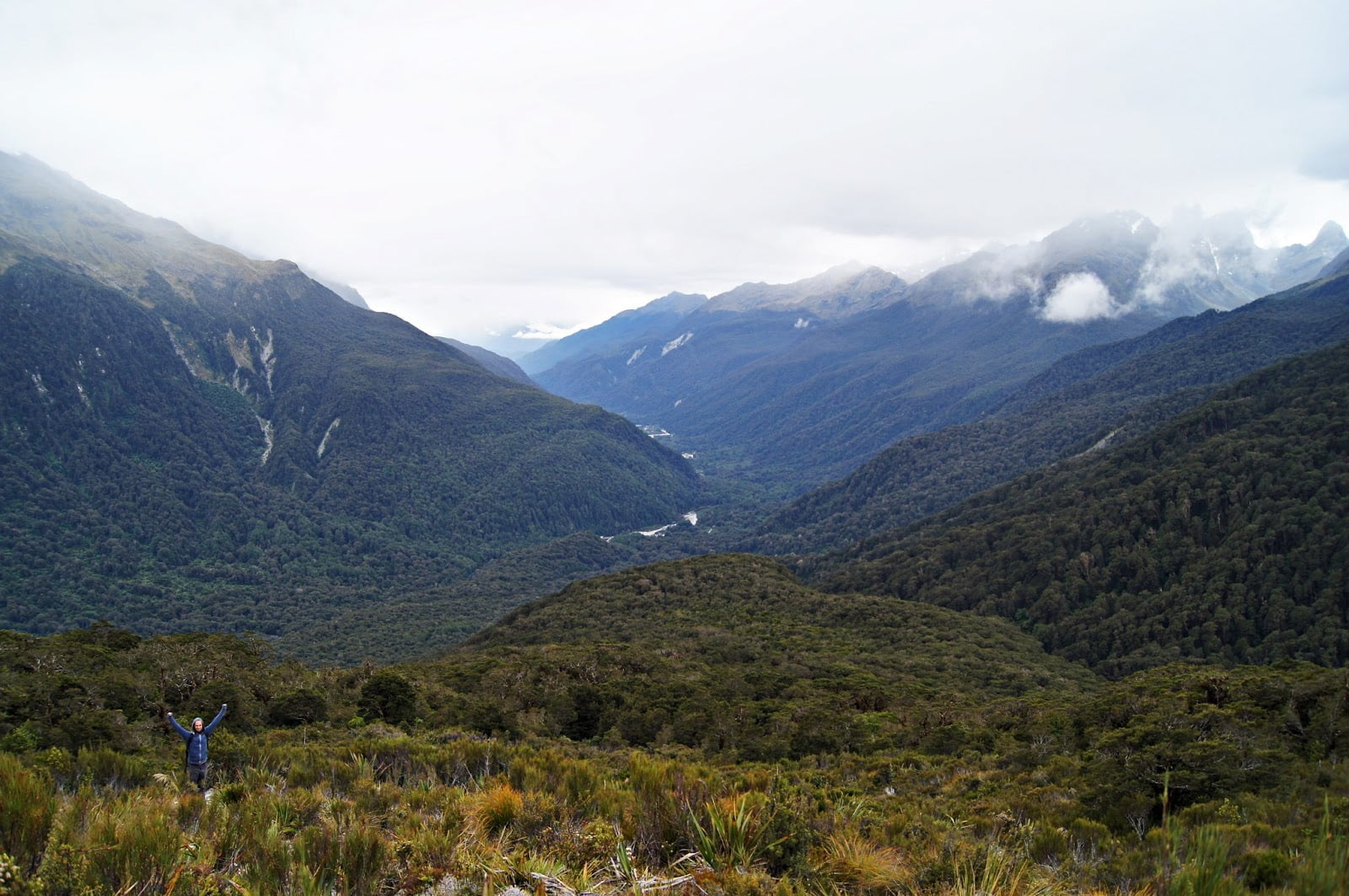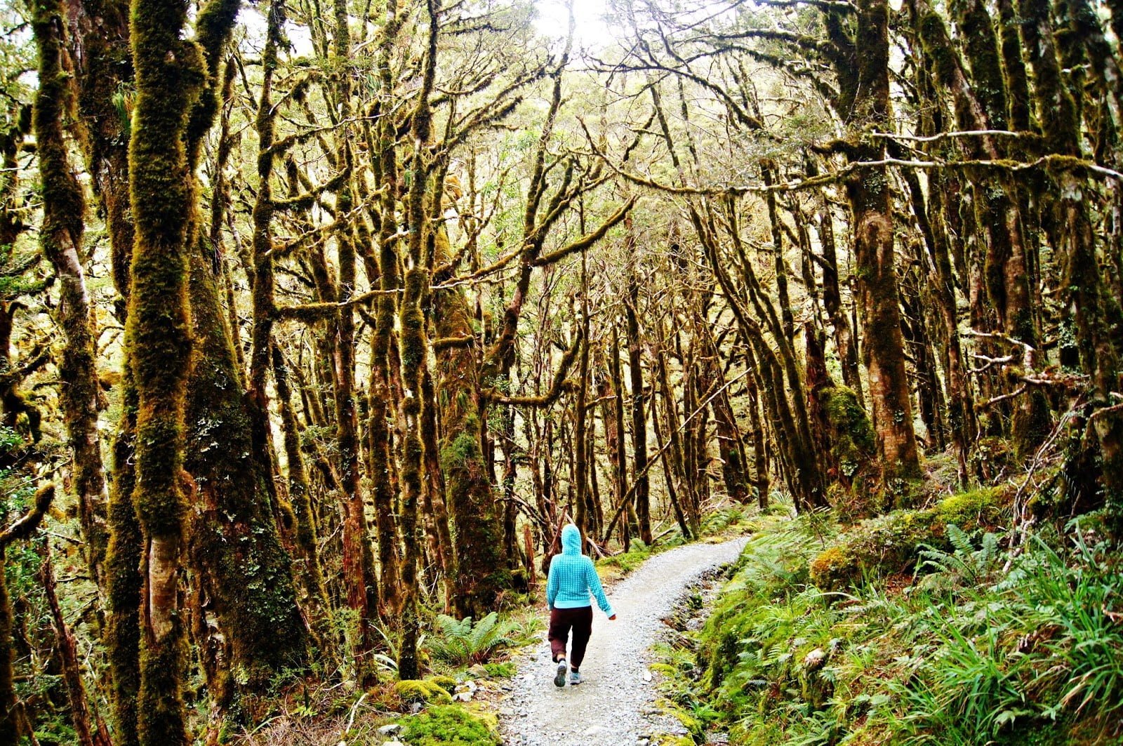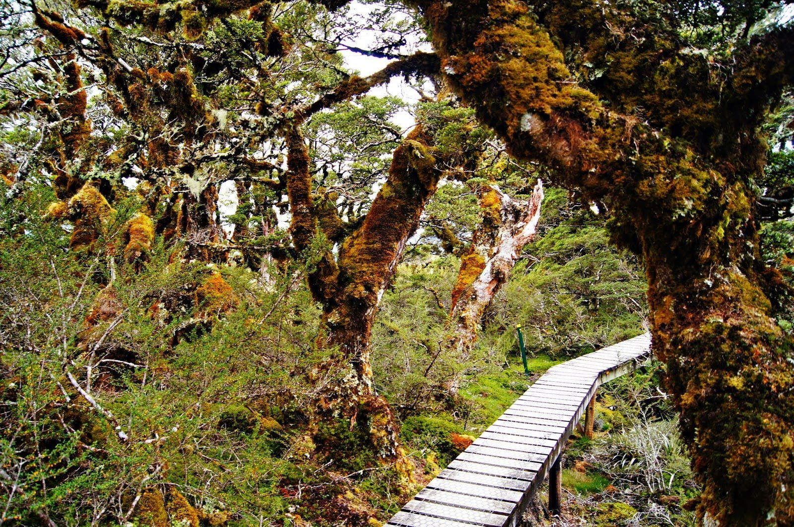 La primera empezaba en el parking de The Divide en nuestro viaje al Milford Sound. Ese día estaba un poco nublado pero todavía podíamos ver las montañas de alrededor aunque no estoy seguro de si se veían los picos más altos, me temo que no. Desde el parking empezamos a subir por un sendero que es bastante empinado, el paisaje del principio es bosque de los de cuentos de hadas, todos los arboles verdes y plantas que estábamos acostumbrados a ver por Fiorland.