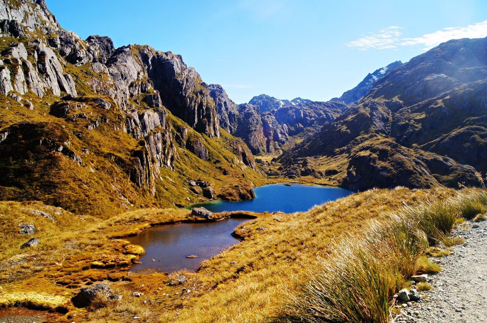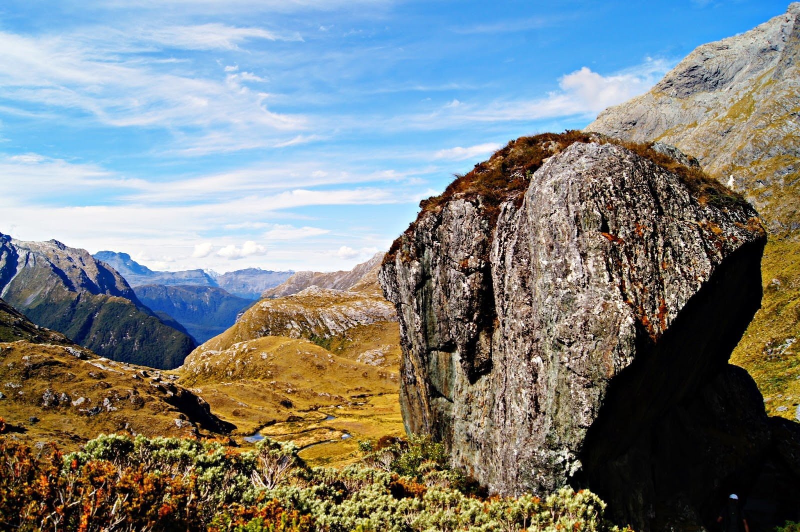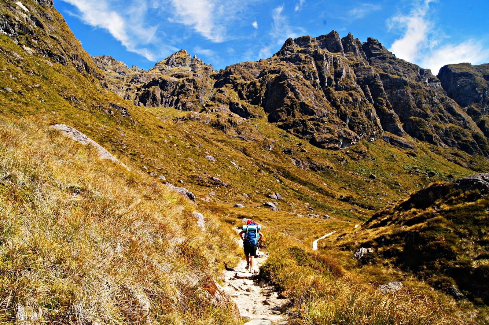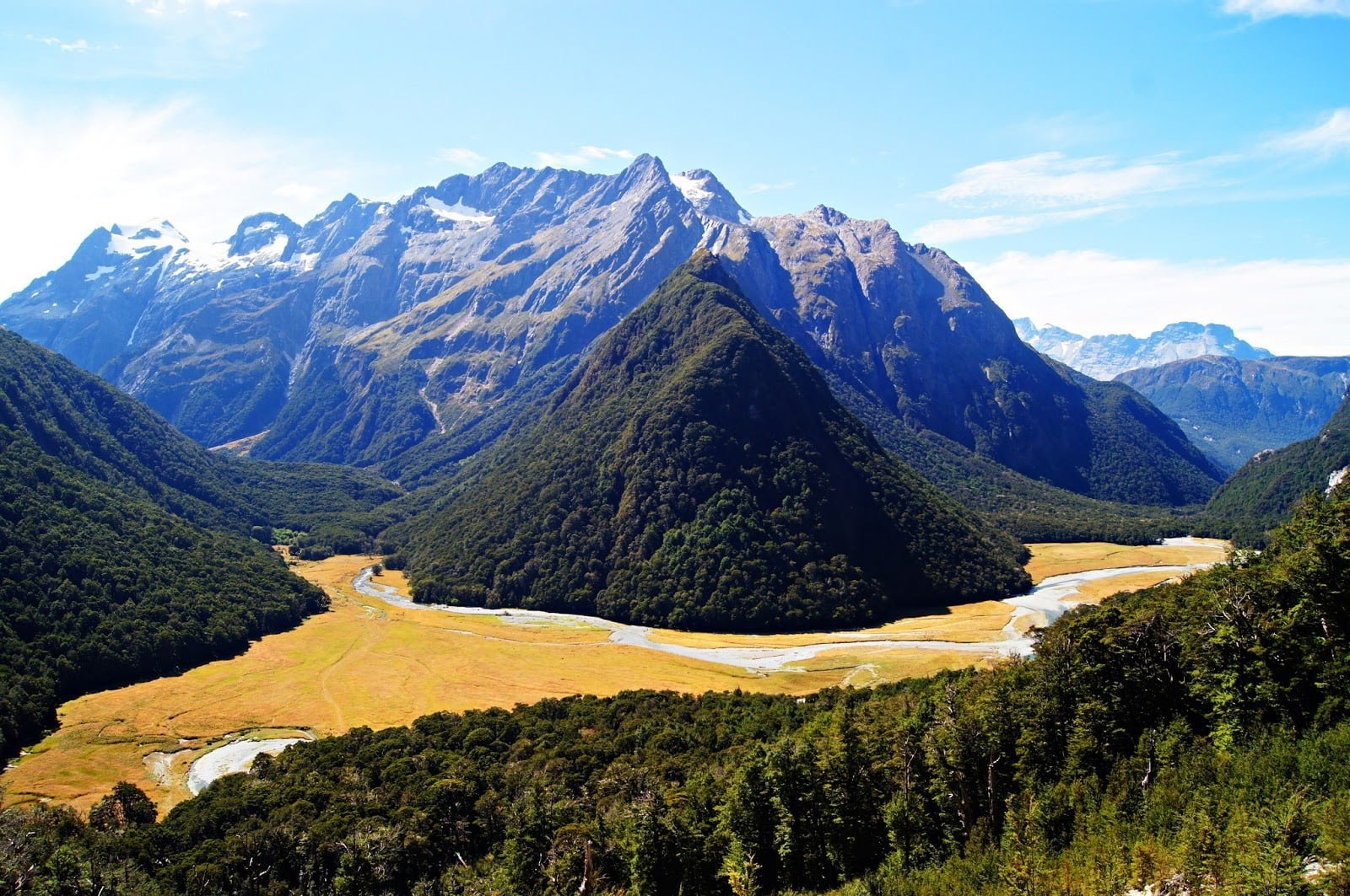 La primera empezaba en el parking de The Divide en nuestro viaje al Milford Sound. Ese día estaba un poco nublado pero todavía podíamos ver las montañas de alrededor aunque no estoy seguro de si se veían los picos más altos, me temo que no. Desde el parking empezamos a subir por un sendero que es bastante empinado, el paisaje del principio es bosque de los de cuentos de hadas, todos los arboles verdes y plantas que estábamos acostumbrados a ver por Fiorland.