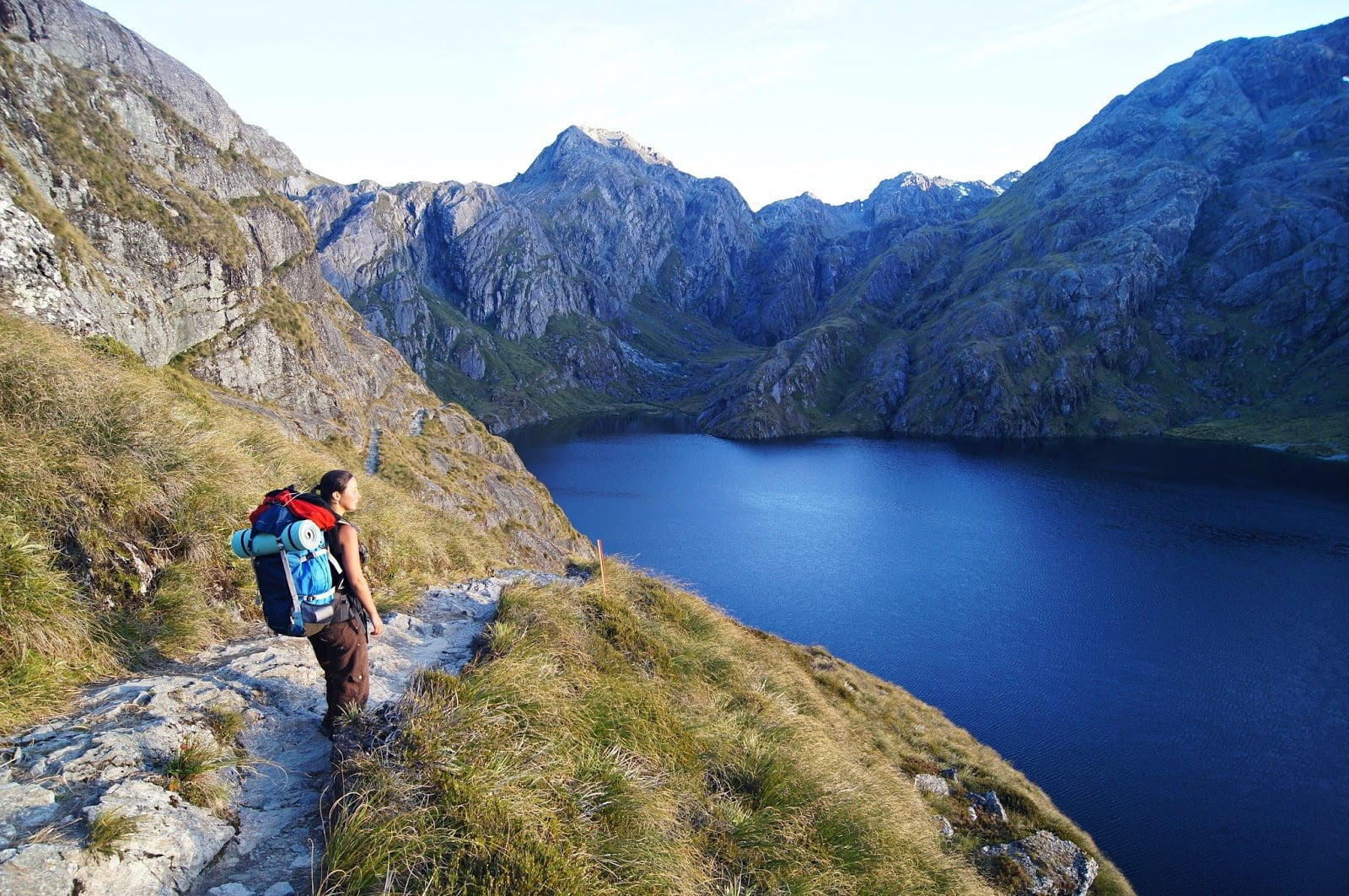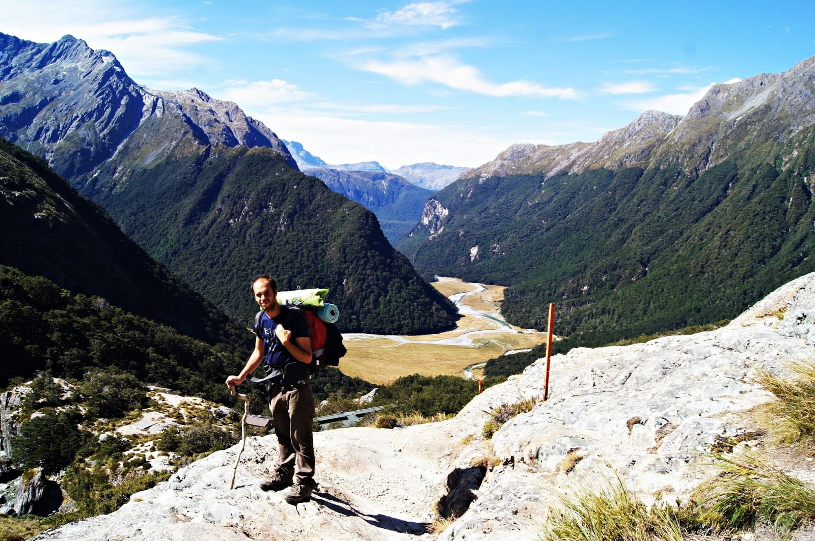 Por si acaso, a la mañana siguiente nos despertamos muy temprano, todavía estaba todo oscuro pero empezaba a amanecer y se podía ver el valle y el sendero que venían por los dos sentidos. Ahora el miedo estaba en que caminando tan temprano por esa parte quería decir que o habíamos salido de noche o habíamos dormido de estranguis por ahí (es lo que pasa con la inseguridad que nos dio el cartel que vimos en Falls Hut) por suerte no nos encontramos con ningún ranger (los que controlan) si vimos a un chico que tenía cara de dormido, seguramente había dormido por ahí también. Nos fuimos directos cuesta arriba al Conical Hill, a eso de los 1500 metros de altura. Normalmente puedes dejar las mochilas en el shelter abajo justo antes de empezar a subir pero nosotros subimos con ellas, tampoco pesaban tanto y queríamos desayunar arriba llevándonos las cosas en ellas.