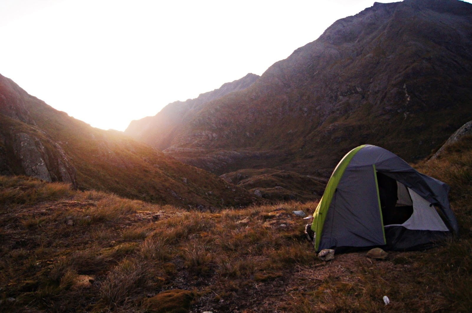 Para dormir teníamos que ir a 500 metros de distancia del sendero pero no era fácil con tanto monte y matas alrededor del sendero, los españoles que conocimos en Te Anau nos recomendaron un sitio, este era antes del lago Morris donde hay una pequeña explanada que llaman el Valle de los Trolls, supongo que los trolls somos los que trolean el Routeburn yendo a dormir gratis ahí, ahorrándonos los 18 dólares que cuesta normalmente para dormir en un camping del Routeburn Track :-P. A pesar de todo no estábamos tan seguros, saliendo del Falls Hut habíamos visto un cartel de que no se podía acampar entre ese punto y el Mackenzie Hut y ese sitio estaba entre esos dos puntos. Pero también ponen muy claro que puedes acampar a 500 metros del sendero sin ninguna excepción así que sin tenerlo muy claro lo hicimos sin más pero con la mosca detrás de la oreja. Son 500 dólares de multa si acampas donde no debes, da para pensárselo dos veces. Para llegar a sitio teníamos que cruzar un rio que casi no cubría y subir y bajar pequeñas colinas, se podía ver que ya había pasado mas gente por este lugar por la hierba que estaba un poco aplastada