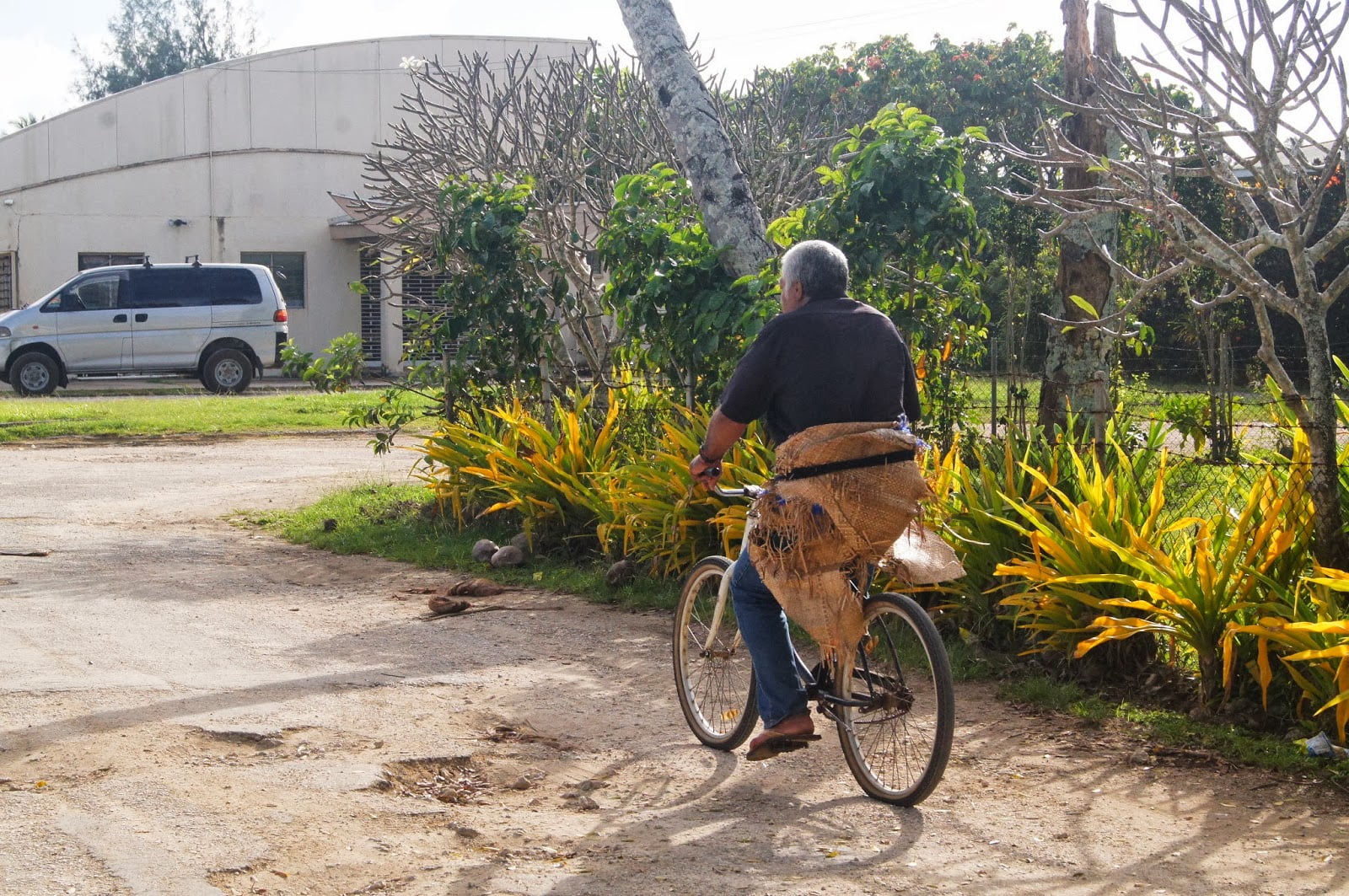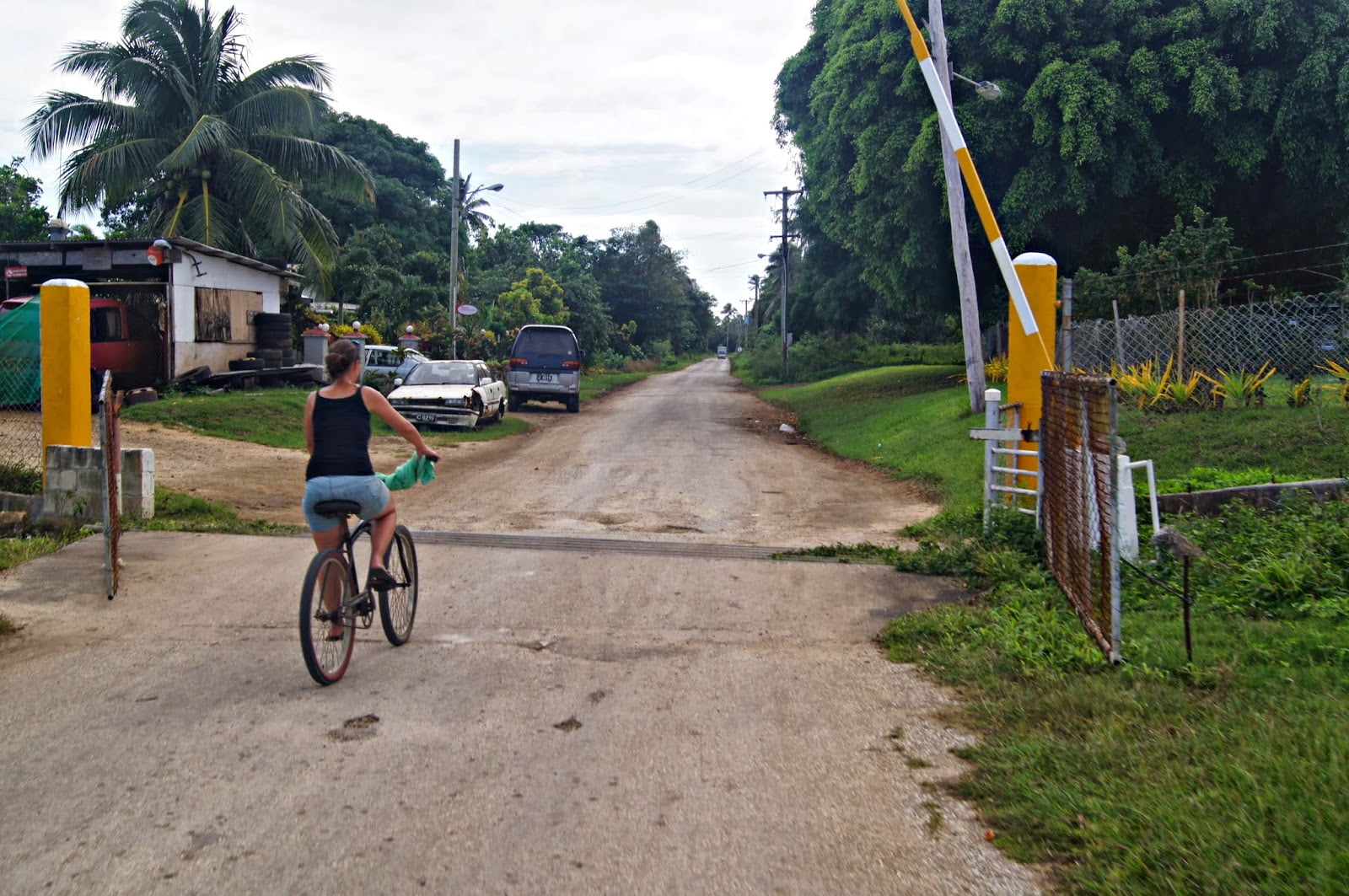 Lo próximo fue ir abajo al bar de Mariner’s Café donde alquilamos unas bicicletas old fashioned y nos fuimos al norte, Pangai se encuentra en mitad de la isla de Lifuka y al norte está unida por un puente con la isla de Foa que es hacia donde fuimos. Pangai es solo un par de calles llena de cerdos y gallinas por todos sitios. Se ve muy poca gente por las calles, caso siempre son niños jugando por la calle, las calles son casi todas de tierra o carreteras muy estrechas por donde pasan los pocos coches que habitan estas islas. La gente te saluda entusiasmada o tímidamente, no pasábamos inadvertidos. Por el camino fuimos viendo bonitas playas y tuvimos que cruzar la pista de aterrizaje de los aviones: