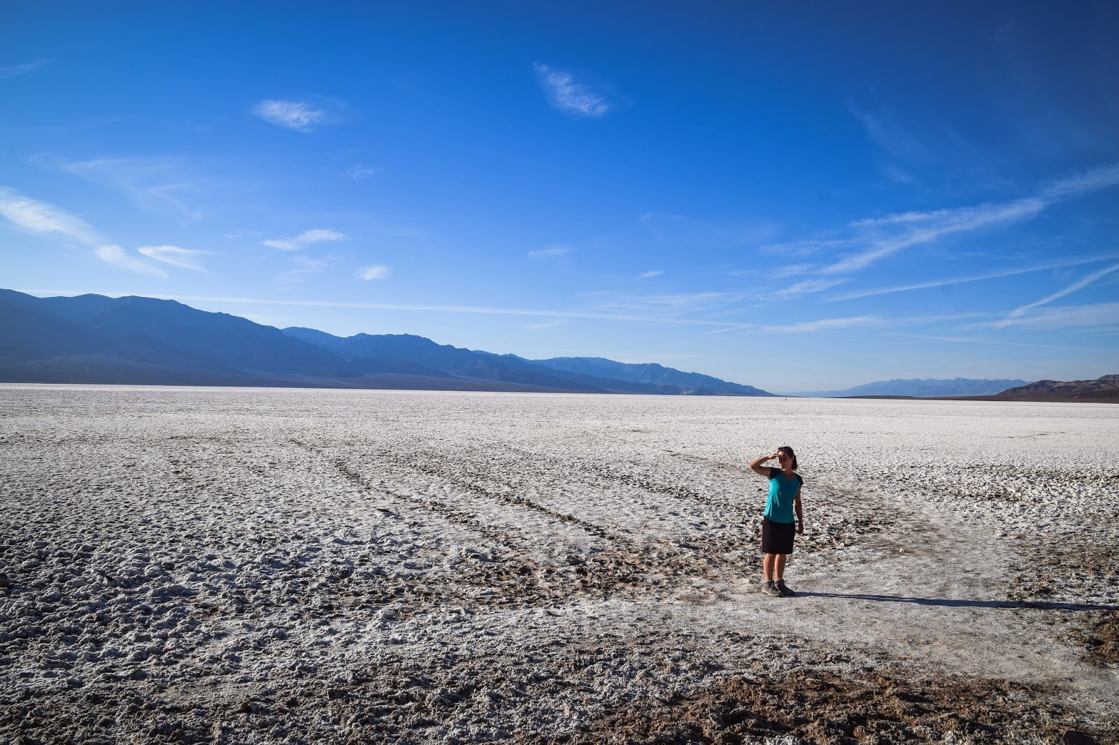 Desde Dante’s View condujimos otra vez muchos kilómetros de vuelta para llegar al posiblemente el lugar más turístico de todo el Valle de la Muerte. Badwater se encuentra bajo el nivel del mar y es el lugar más caluroso del planeta. En verano, se dice que se puede hasta freír huevos en el capo del coche o en la sartén poniéndola en el asfalto. Cuando estuvimos nosotros no hacía tanto calor como para comprobarlo pero sí que era un poco inaguantable. En este lugar se registraron los famosos 57 grados de temperatura, el récord de máximo calor con lo que la vida que hay es casi nula. Una explanada de tierra cubierta de sal es por donde se puede andar libremente, dejándote la sensación un tanto extraña. Es el lugar más bajo del hemisferio oeste pero no del planeta, ese premio se lo lleva el Mar Muertoque también tuve la suerte de visitar en mi viaje en solitario porIsrael y Palestina, dos sensaciones diferentes pero parecidas.