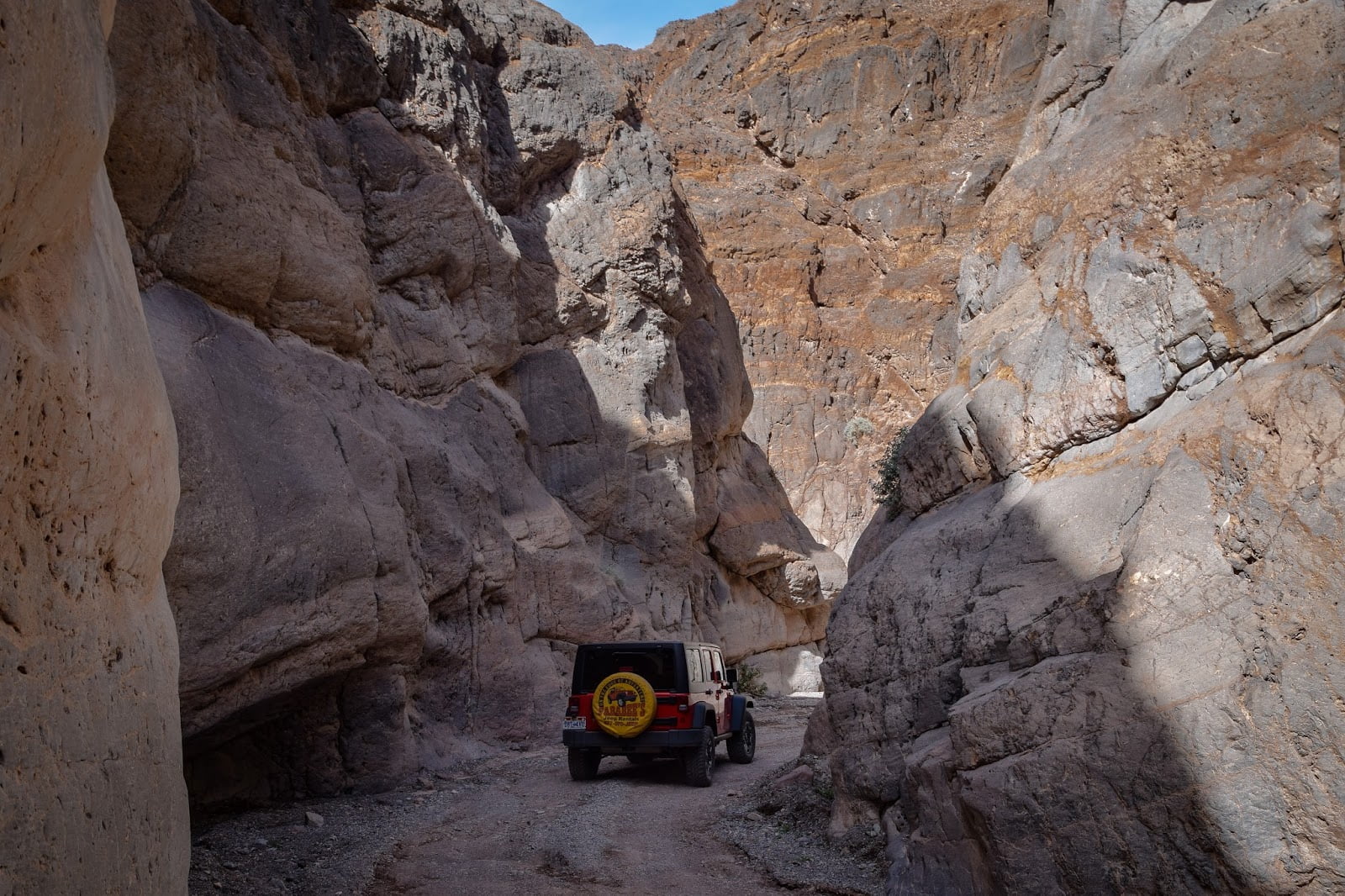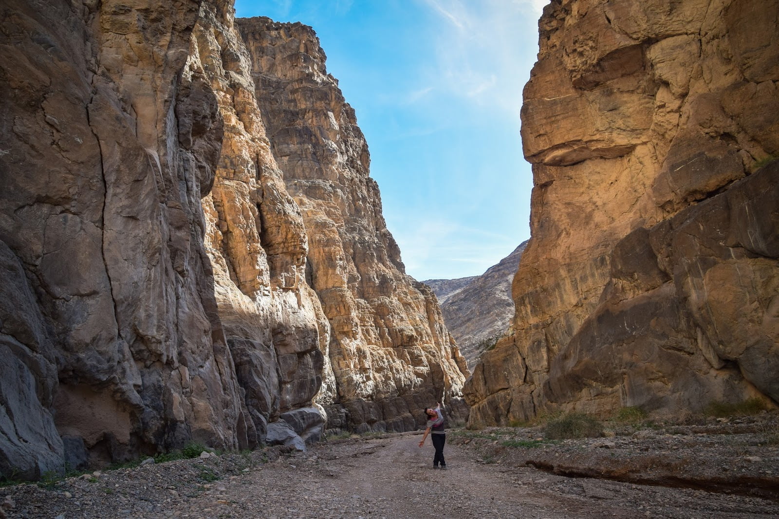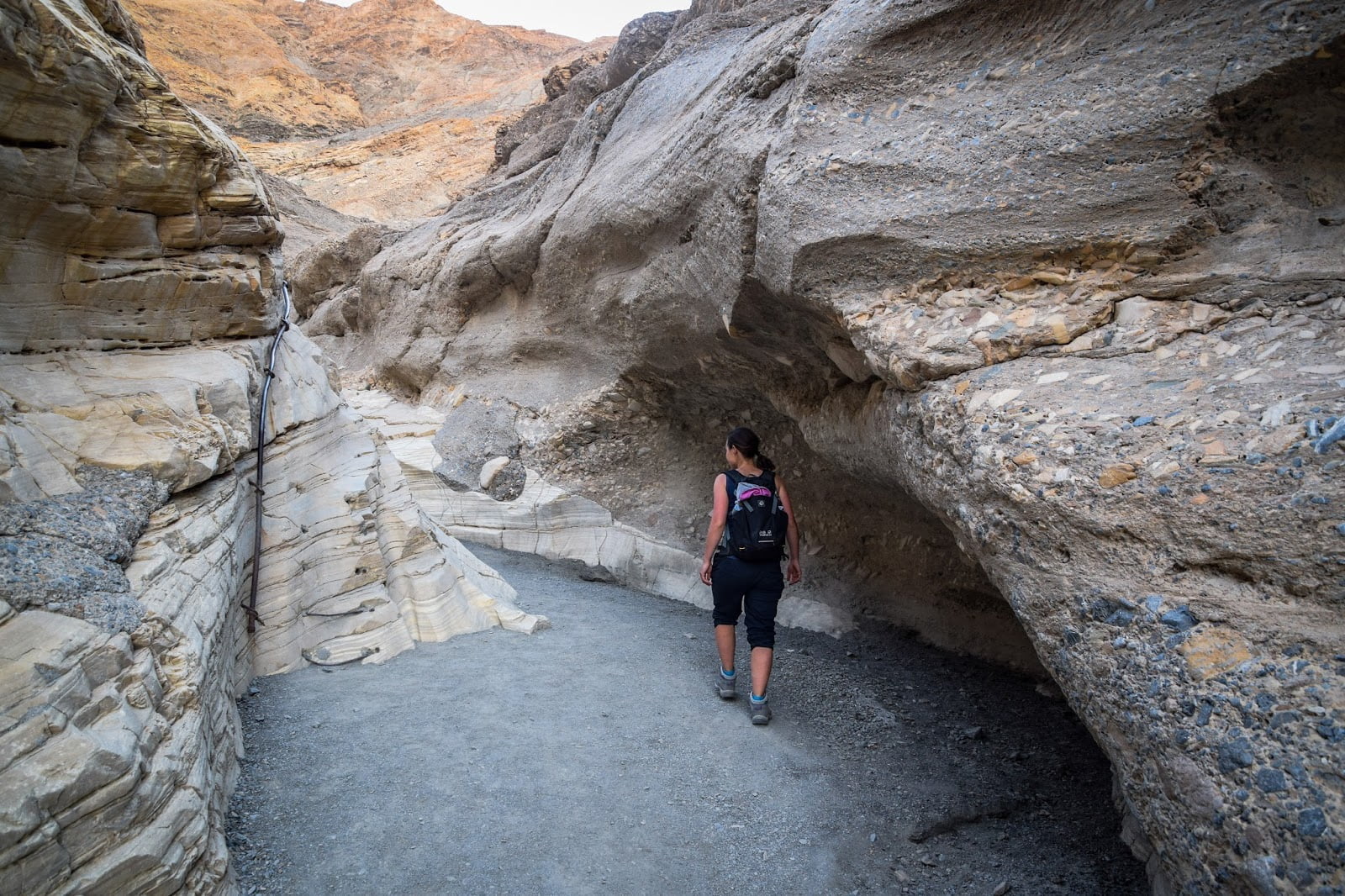 Desde Ubehebe empezamos a volver hacia el centro del parque pasando antes por un cañón muy conocido del parque. Conocido sobre todos para los que tienen coche 4×4 a su disposición ya que es un cañón por el que se puede conducir a través de él. Sin embargo, se puede hacer un tramo a pie si llegas por el sur y aparcas en el parking que tienen para ello. Llegar hasta el parking no es fácil y es arriesgado para un coche normal como el nuestro. Aunque nos dijeran que se podía hacer con coche normal nos pareció un poco peligroso, el estado de la carretera es penoso y las ruedas sufren mucho, a veces solo podíamos ir a apenas 10 km/h y son como unos 5 km. Llegamos bien e hicimos a pie algunos kilómetros cañón adentro hasta que el paisaje ya no era tan espectacular, es difícil saber cuando tienes que parar. Dos paredes se alzan a los costados haciéndote sentir un enano. Para aquellos que tienen más tiempo se puede hacer el cercano pero más largo e igual o más espectacular (según dicen) Fall Canyon, que solo es para personas.