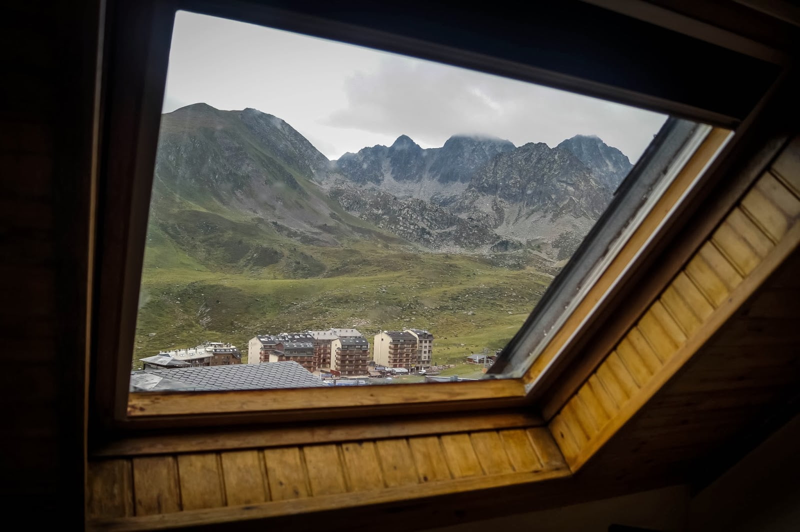 Estábamos en septiembre pero el frío se notaba al ir subiendo metros de altitud. Nuestro primer destino era llegar al pueblo fronterizo con Francia de Pas de la Casa, un pueblo a 2.400 metros de altitud. Pas de la Casa es bien conocido como destino para deportes de invierno y es en invierno cuando está lleno hasta los topes, en su temporada alta cuando todo está cubierto de nieve. Nosotros veníamos a ver el bonito paisaje montañoso ya que nieve no había todavía. Desde nuestro hotel se podía ver esto, los pirineos son preciosos, me gustaba la idea de despertar con estas vistas. El hotel nos salió por 30€, estoy seguro de que en invierno cuesta el doble o más.