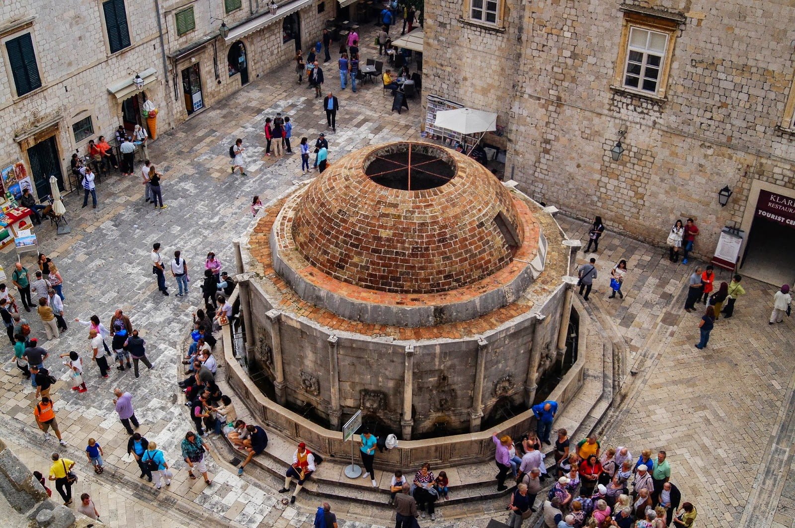 Al completar la vuelta por las murallas a toda la ciudad vieja bajamos por fin a conocer su interior. Con la lluvia se abrían los paraguas con lo que las calles se llenaban aún más. No se puede negar, Dubrovnik tiene mucho encanto a pesar de todo, sus callejuelas con esas lamparillas colgando son preciosas y sus edificios están muy bien conservados. Pasando por la hermosa y concurrida Puerta de Pile te encuentras con la peculiar Fuente de Onofrio que actualmente sigue dando agua potable a la población, suele servir de centro de encuentro de los turistas ya que cerca se encuentra la oficina de turismo, muchos se sientan en ella como podéis comprobar en la foto.