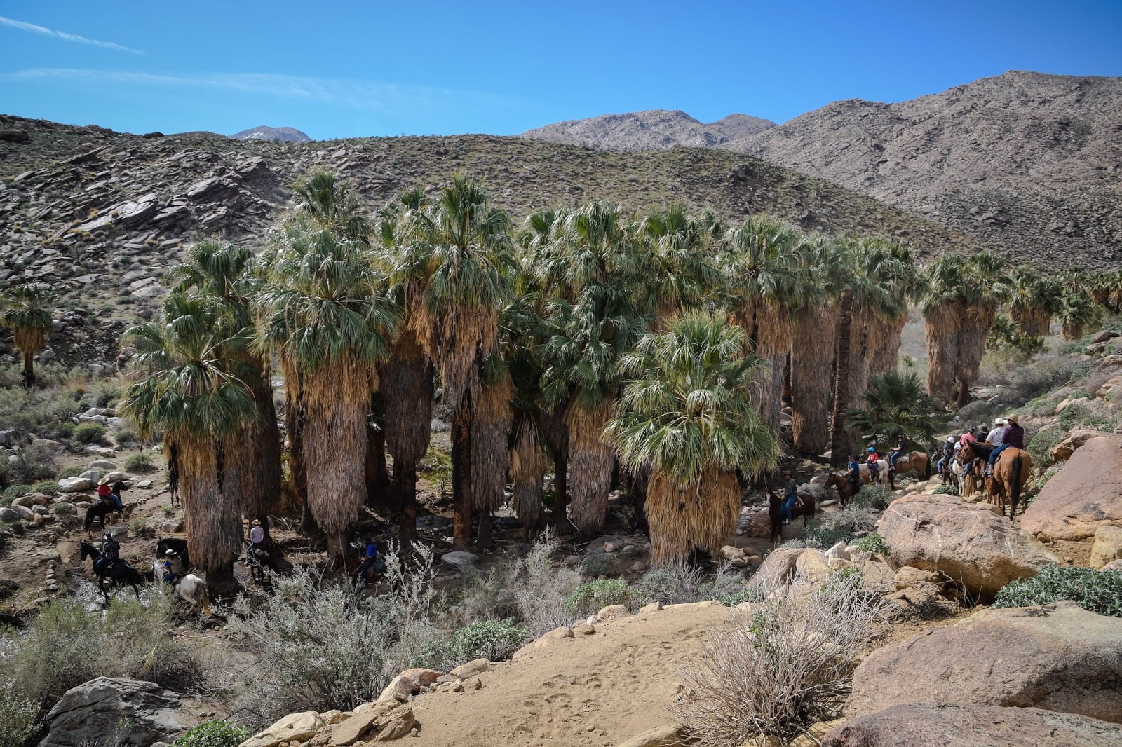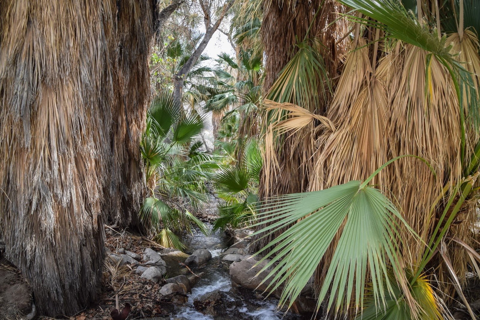 Tras tal sorpresa nos dirigimos a hacer un poco de senderismo, hiking como dicen por aquí. Exactamente entramos a un territorio privado protegido por tribus indias llamado Indian Canyons, al cual se entra pagando una entrada. Hacemos uno de sus senderos que nos lleva a otro oasis similar al que vimos en Anza-Borrego, un sendero muy visitado por gente a caballo. Un lugar precioso con grandes vistas en un desierto algo diferente de lo que habíamos visto estos días anteriores. Fue una gran excursión a tan solos algunos minutos en coche desde la ciudad.