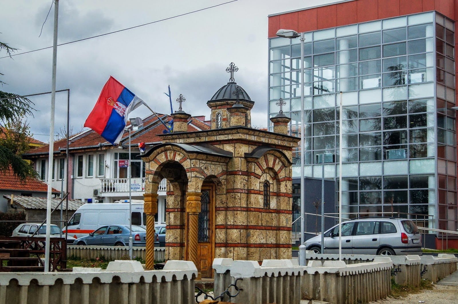Callejeando vimos más templos ortodoxos serbios protegidos con alambre de espinos pero esta vez mejor conservados que el anterior, es curioso como los serbios pretenden proteger su patrimonio de posibles ataques en una zona que aún consideran como suya. ¿Acaso no son civilizaciones que nada tienen que ver entre sí?, ¿pretenden que gente tan diferente respecto a creencias, raíces o lengua idealicen una misma bandera, himno y nación?, ¿o es que la intención serbia sea echar a los albanokosovares de la región? No voy a entrar demasiado en el tema porque es un asunto con muchas filigranas que aún no logro de entender del todo, no todo es tan sencillo como se supone. Por desgracia es algo que ocurre en innumerables lugares en el mundo. El debate inacabable.