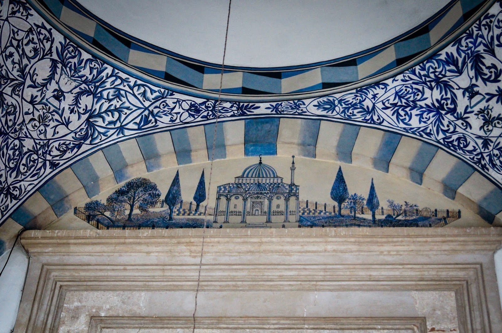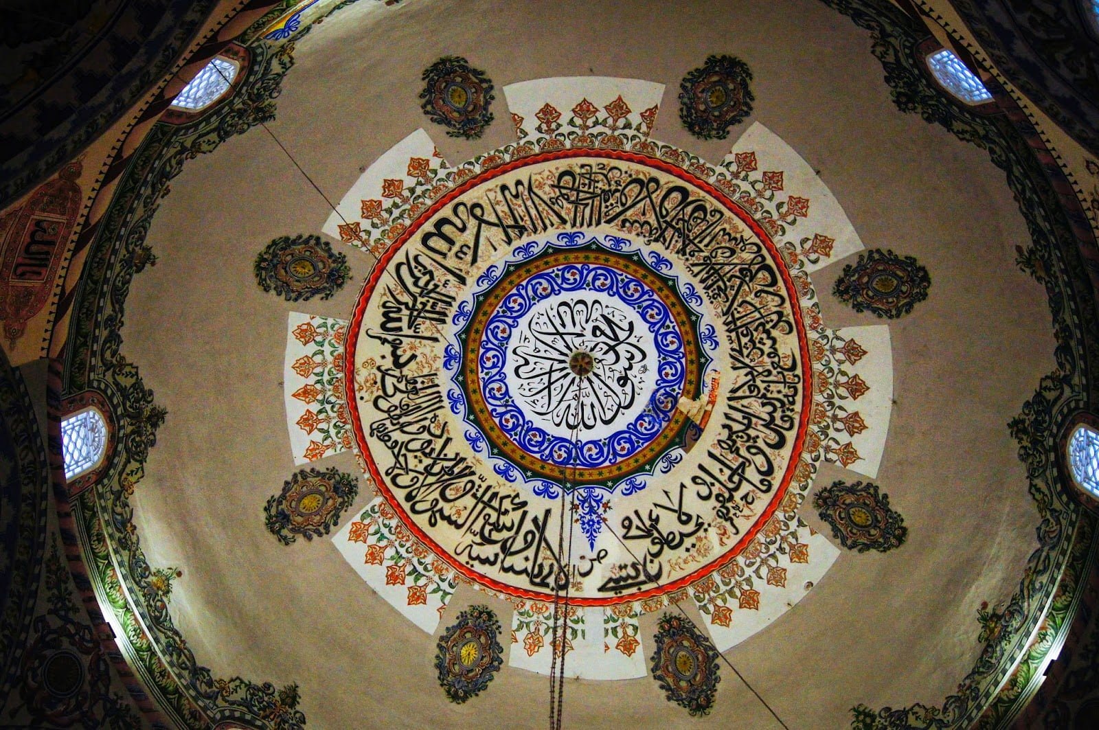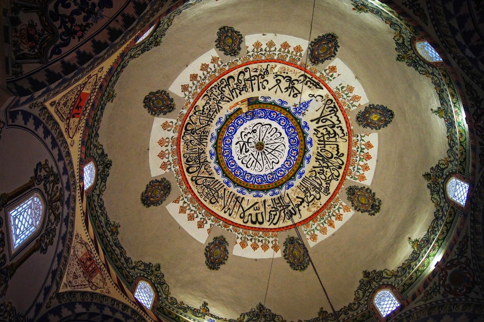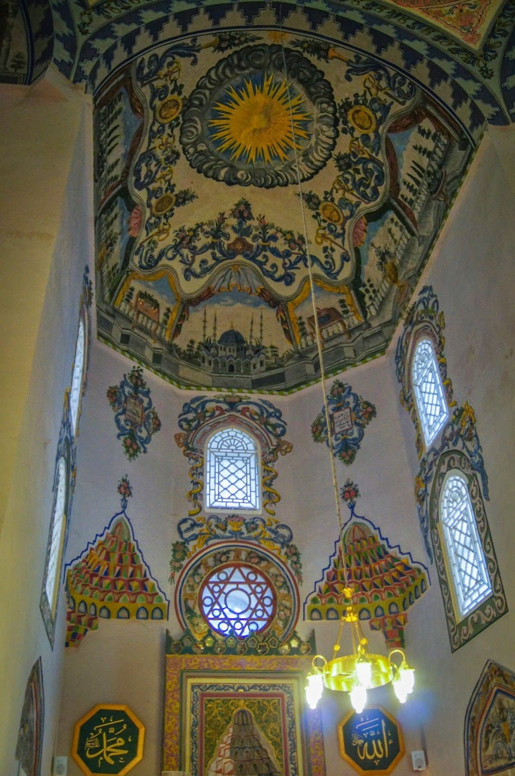 Paseando por sus calles paramos en la mezquita más importante de la ciudad llamada Sinan Pashá en la plaza Shadërva y preguntamos si podíamos entrar a ella, cosa que no fue problema. Al entrar y mirar hacia arriba quedé con la boca abierta durante un buen rato. Fue lo más bonito que jamás vi en una mezquita, una preciosidad que se encontraba encima de nuestras coronillas, una poesía en forma circular con una de las caligrafías más bonitas que existen ,pues así me parece el árabe. No habíamos pisado Estambul aún pero era algo que era difícil de superar, me hubiera quedado horas mirándolo y aún me sorprende cuando miro las fotos que tomamos, comprobadlo vosotros mismos en las siguientes imágenes. Al otro lado del río hay un Hamman que estaba en pleno proceso de renovación y la mezquita Gazl Mehmet Pasha, como veis, el patrimonio que mejor se conserva es lo que quedó del paso de los otomanos. Algo que ocurrió no hace tanto como uno piensa.