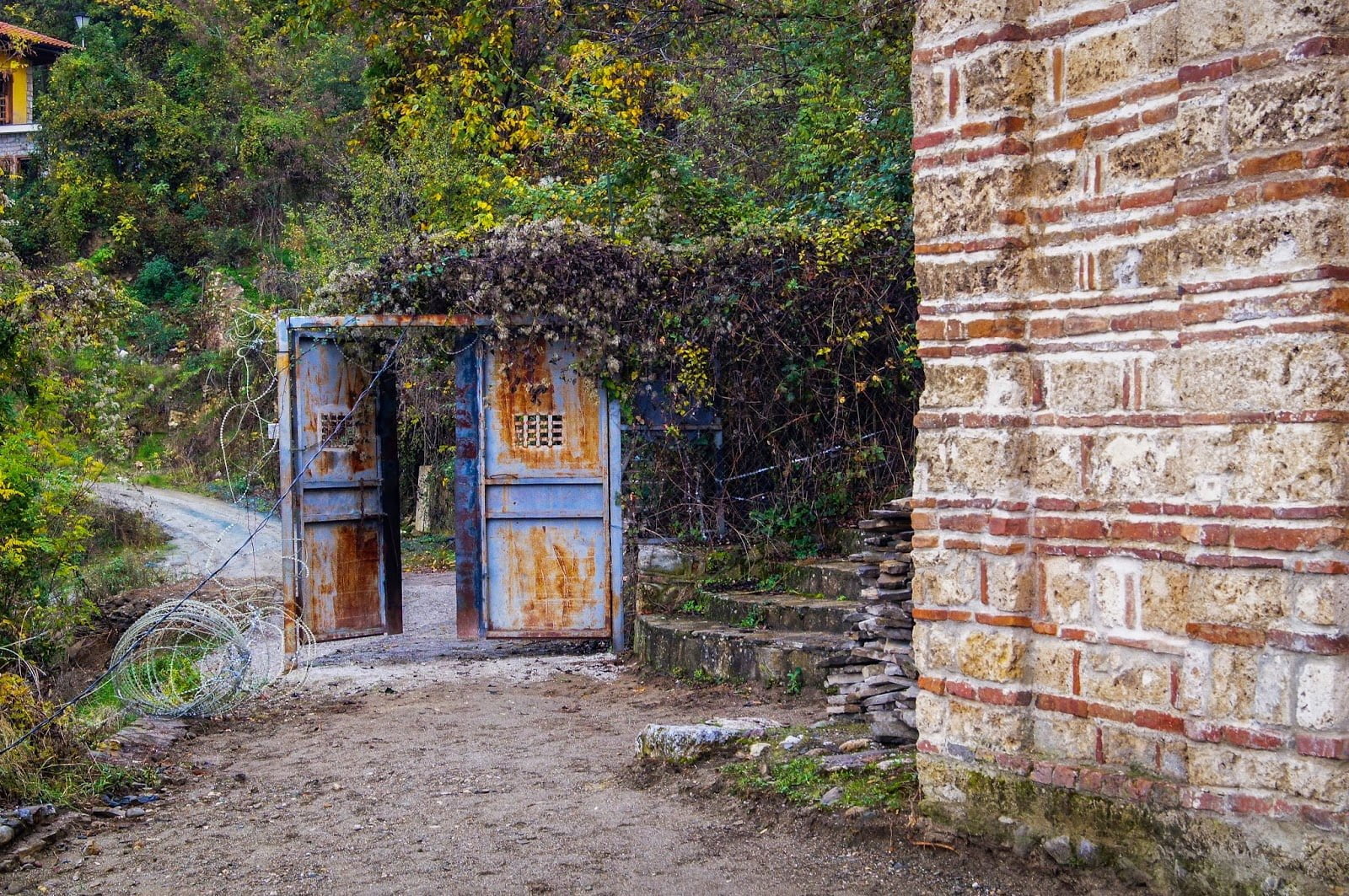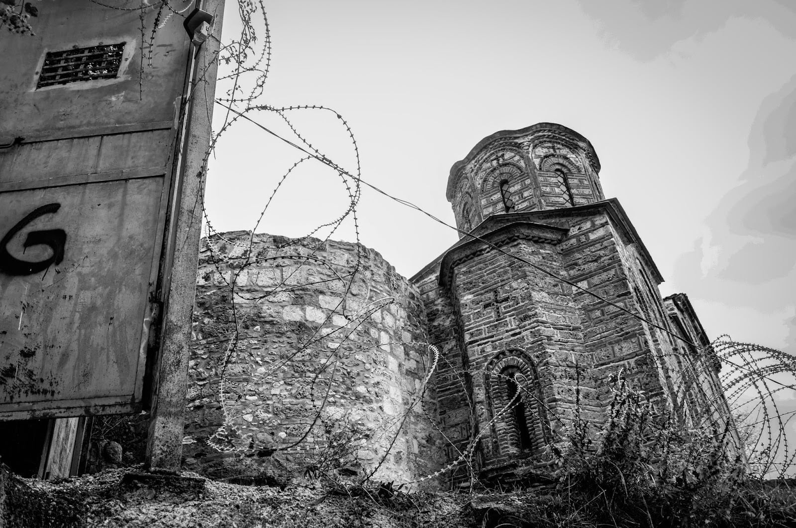 Continuamos y fuimos mirando hacia arriba buscando el camino hacia la fortaleza Kaljaja, nuestro objetivo principal. Callejeando por calles casi en vertical pudimos ir llegando poco a poco a ella. Por el camino nos encontramos con un templo ortodoxo abandonado serbio, protegido con alambre de espinos pero parcialmente destruido. Parece ser que no aguantó el conflicto. Una puerta oxidada y que casi se caía a pedazos fue por donde pudimos entrar (normalmente no se puede). Por fuera se mantiene visiblemente bien pero por dentro esta destrozada con todo cubierto de malas hierbas.