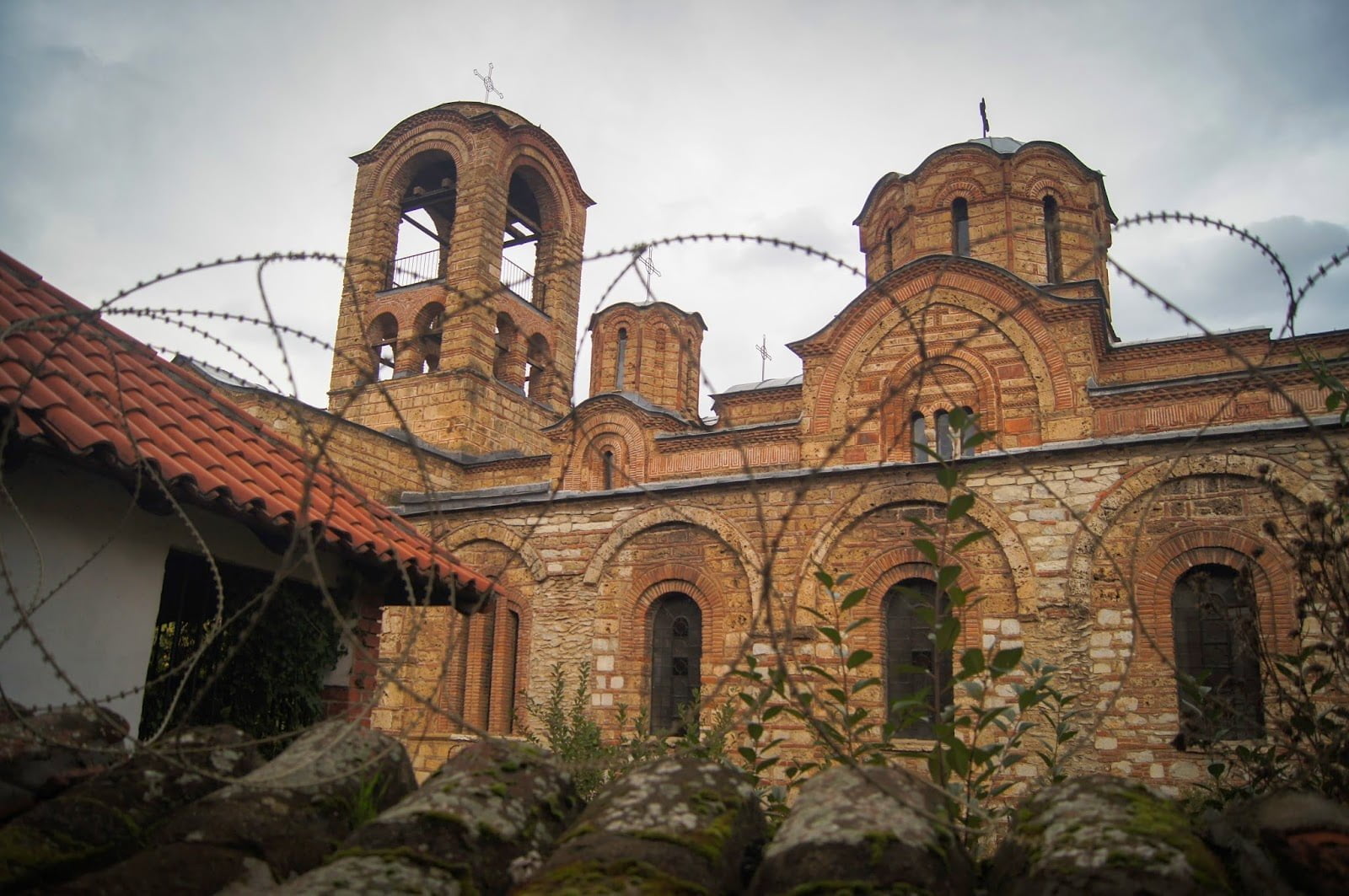El monasterio Gračanica se encuentra en un enclave serbio llamado Gračanica, una zona de serbios dentro de Kosovo, aunque parezca mentira, es como entrar de nuevo a Serbia por unos instantes. Las banderas de este país ondean en las rotondas y casas de la zona. No notamos el ambiente crispado o alterado aunque no creo que los habitantes de por aquí vivan muy cómodos con la situación. El monasterio en sí está protegido con alambre de espinos por el conflicto entre ellos y diferencias en la religión, fue declarado patrimonio en peligro.
