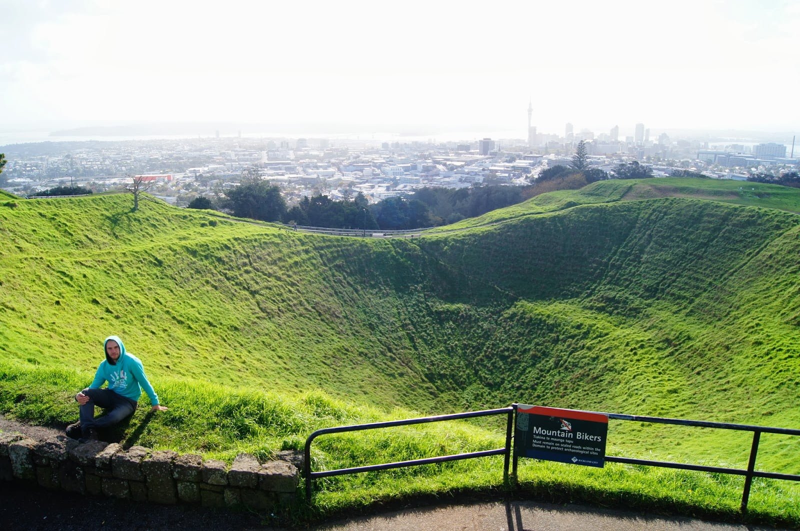 Seguimos por el camino que viene normalmente marcado por la calle pero lo seguimos mejor en el mapa que llevábamos porque a veces la señalización era un poco confusa. Continuamos por el parque de Mt Eden, un cono volcánico en el que se puede ver perfectamente el cráter. Ahora está lleno de hierba corta, es algo digno de ver. La subida no es muy larga pero sí que está bastante cuesta arriba. Desde allí se tienen unas vistas magnificas de todo Auckland de 360 grados. Si vienes a Auckland este es uno de los sitios que no puedes perderte.