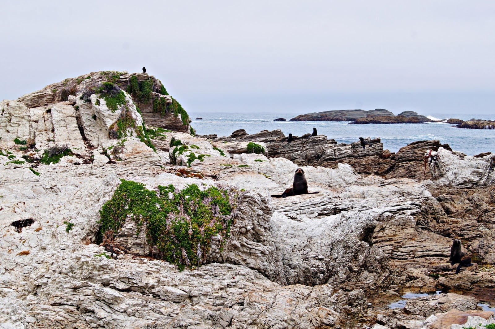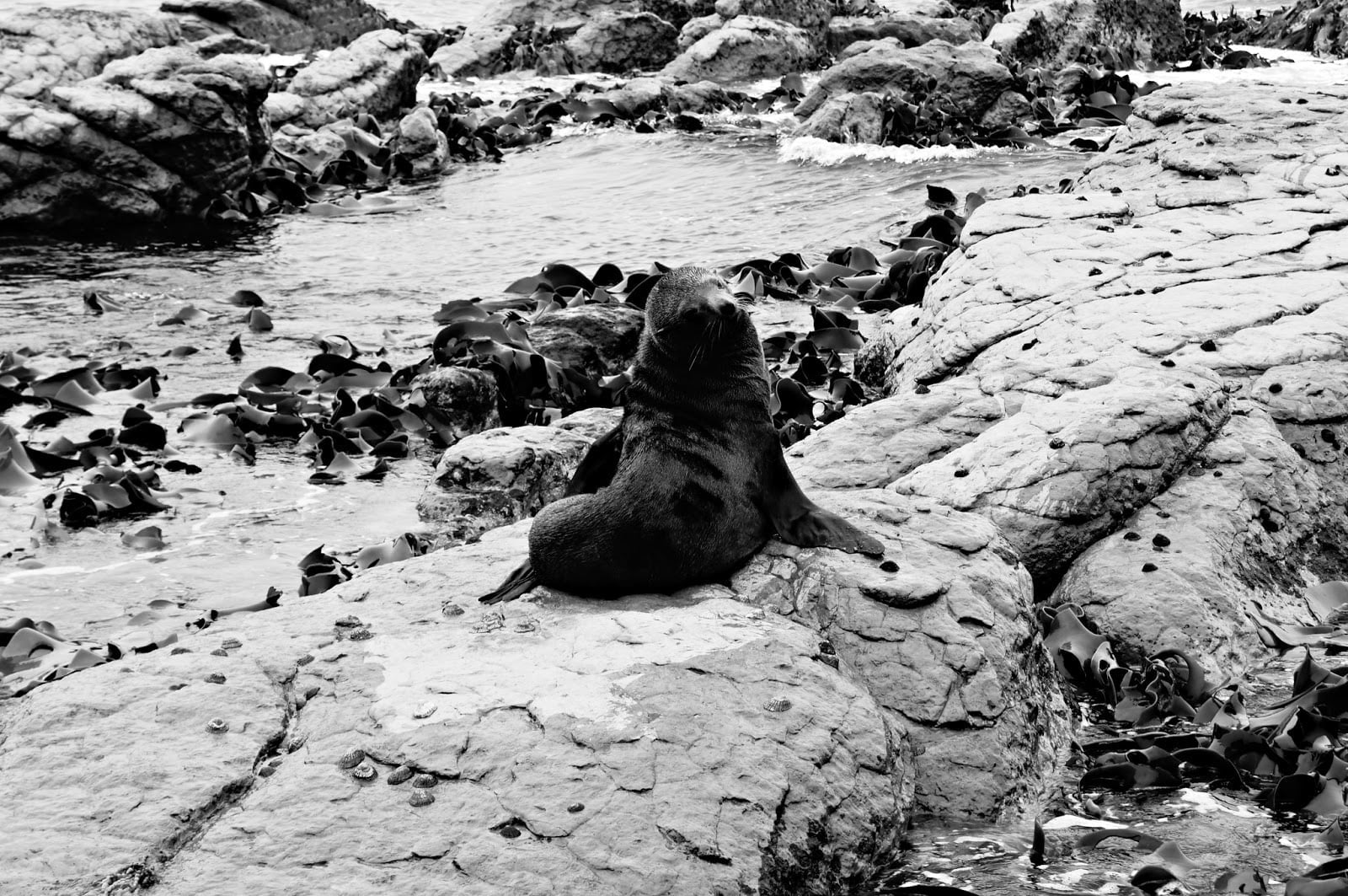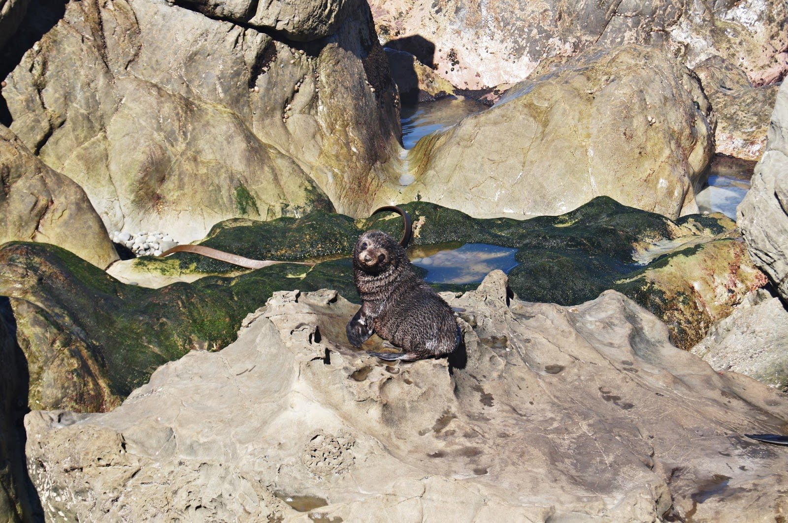 Devolvimos los trajes a la tienda y nos fuimos de Kaikoura hacia el norte, directos a Ohau para ver una colonia de cachorros de focas. Primero paramos en un mirador desde la carretera del que se podía bajar a la playa. Las rocas estaban todo llenas de cachorros de focas, aunque también había algún adulto vigilando por la zona.