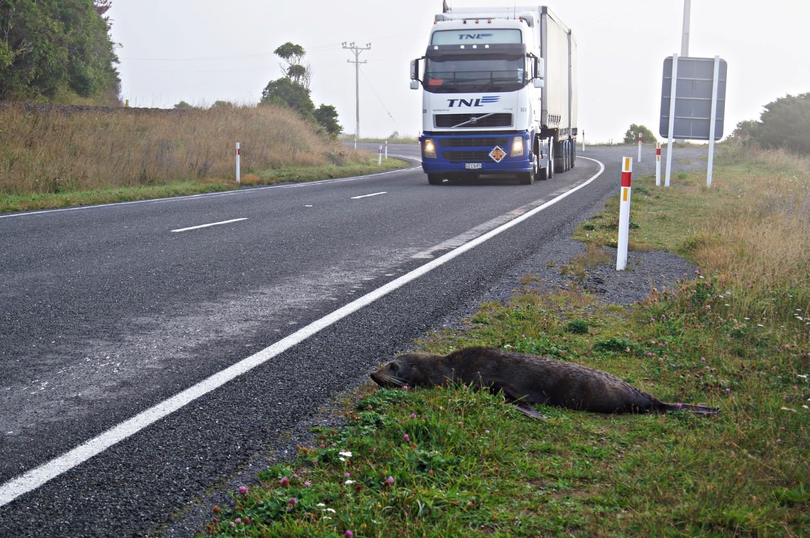 Acampamos en la misma playa donde aparecen los delfines listos para meternos en el agua y nadar con ellos pero el día no amaneció para nada como esperábamos. Estaba todo nublado lo que no es un problema, lo peor fue que el mar estaba muy picado y peligroso, con olas muy grandes. Se entraba por un sitio rocoso y eso lo hacia muy peligroso. Estuvimos dudando allí si intentarlo o no, además, los delfines se veían más lejos de lo que estaban el día anterior. Aún así, Perrine quería intentarlo, pero una vez en la orilla se dio cuenta de que era una locura así que con mucha pena decidimos no hacerlo. Para usar los trajes de neoprenos que habíamos pagado nos metimos en el mar en otra playa de arena más cerca de Kaikoura, el tiempo había mejorado y hacía sol, aún así se notaba lo fría que estaba el agua aunque tuviéramos los trajes puestos ¡que dolor! Por la carretera de vuelta vimos algo curioso, una foca que estaba casi en la carretera, los coches y camiones pasaban a pocos metros de ella y esta ni se inmutaba, curiosa estampa.
