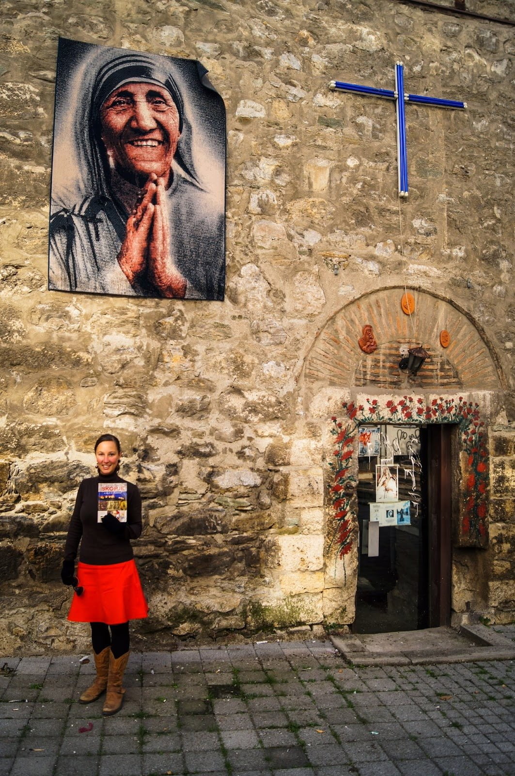 Por una de las calles principales nos encontramos un edificio de lo más extraño, estábamos frente el Memorial House de la madre Teresa de Calcuta. Se ve de lejos que es un lugar especial, arriba tiene como un pequeño museo y una capilla decorada con imágenes de Teresa de Calcuta, la entrada es gratuita y como mucho echarás media hora en verlo todo tranquilamente. En entradas anteriores ya expliqué sobre la importancia de ella en Macedonia y Albania. Teresa de Calcuta nació en Skopje pero sin embargo se crió en Albania, sus padres eran de procedencia albana. Nos encontramos con estatuas de ella por casi cada ciudad que visitamos de Albania y Macedonia pero este edificio superaba a todo lo que habíamos visto, construido en 2009 y con arquitectura diferente es uno de los lugares más visitados de toda Macedonia.