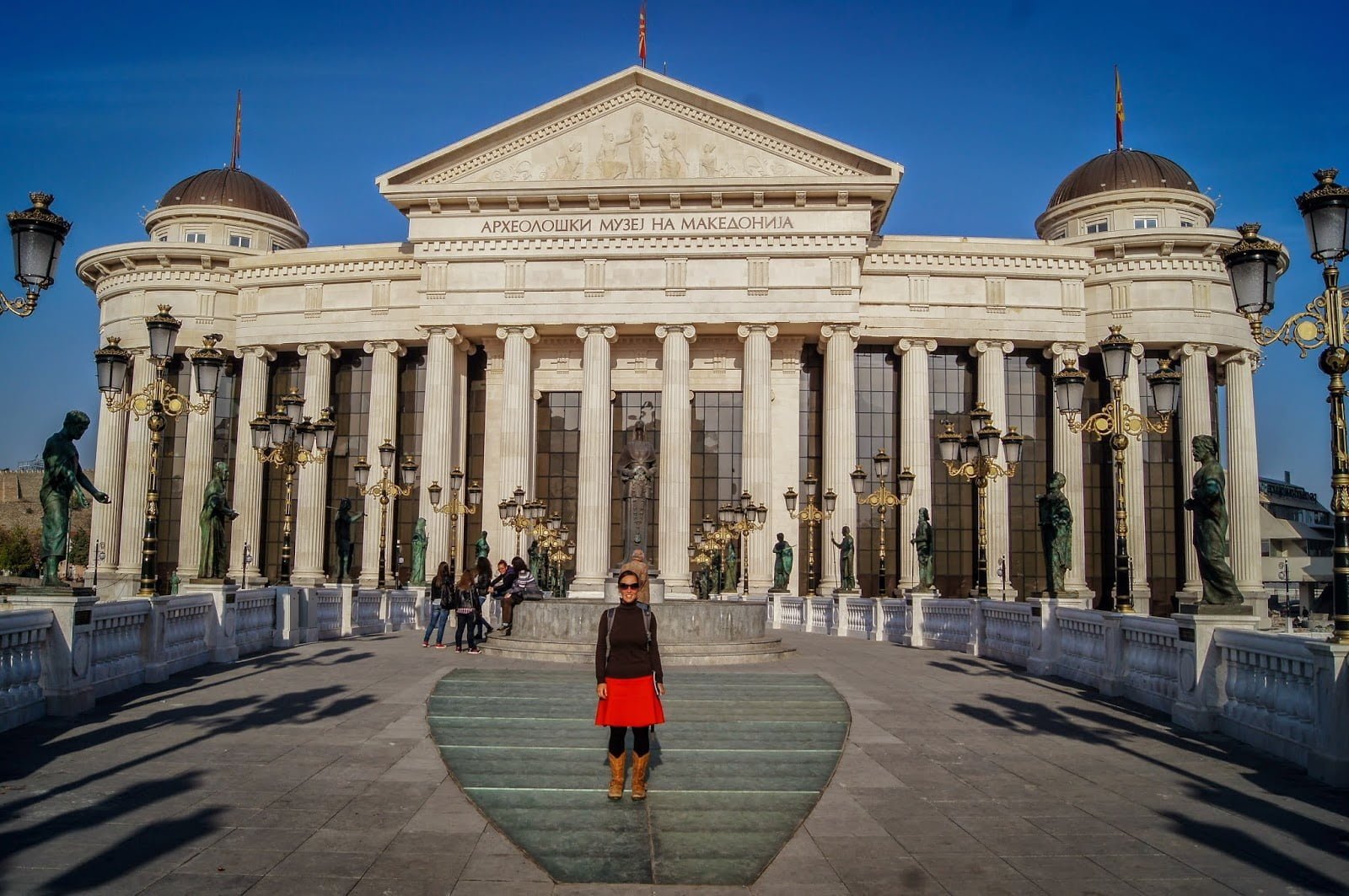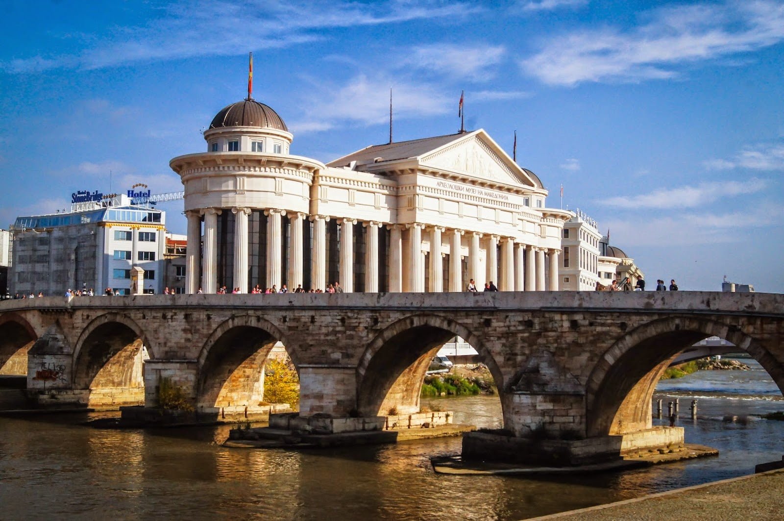 Fotografiamos casi cada edificio que se puede ver por la plaza y por la otra parte del río Vardar, el que cruzamos por uno de sus varios e impolutos puentes, su famoso y principal puente de piedra. Los demás son unos puentes decorados con decenas de estatuas, a cual más bonita. Edificios como el impresionante y nuevo museo arqueológico nos entretuvieron un buen rato tanto de noche como de día.
