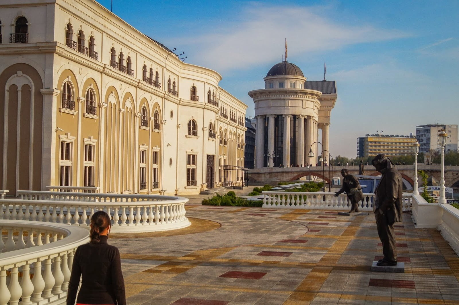 Siguiendo la calle llegábamos al lugar más céntrico y sorprendente de Skopje que hizo que tuviéramos la boca abierta durante al menos media hora. ¿De donde ha salido todo esto? ¿Habíamos vuelto a Viena? Quizás esté exagerando un poco pero de no esperarte gran cosa a ver la plaza de Macedonia y alrededores llena de todas esas estatuas y edificios nuevos es cuanto menos sorprendente.
