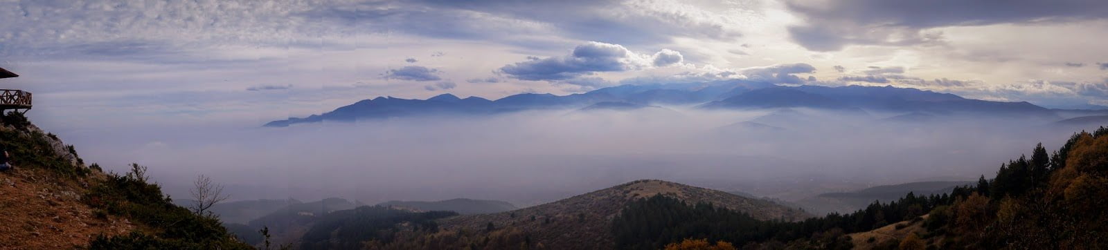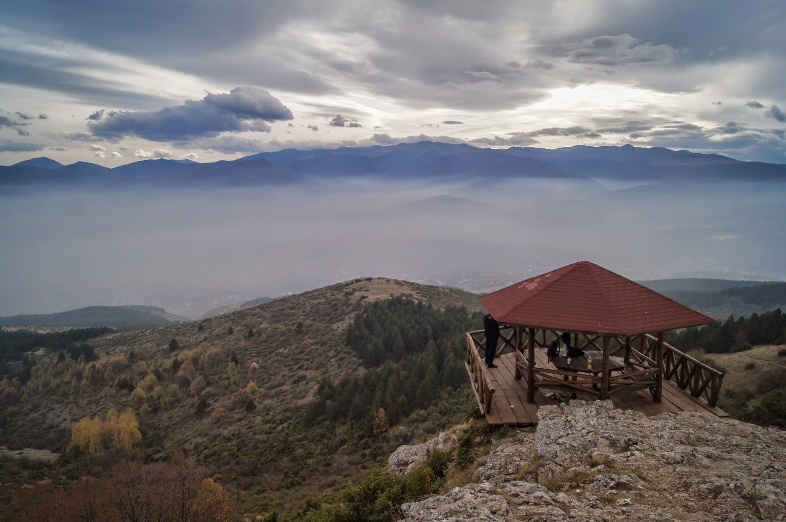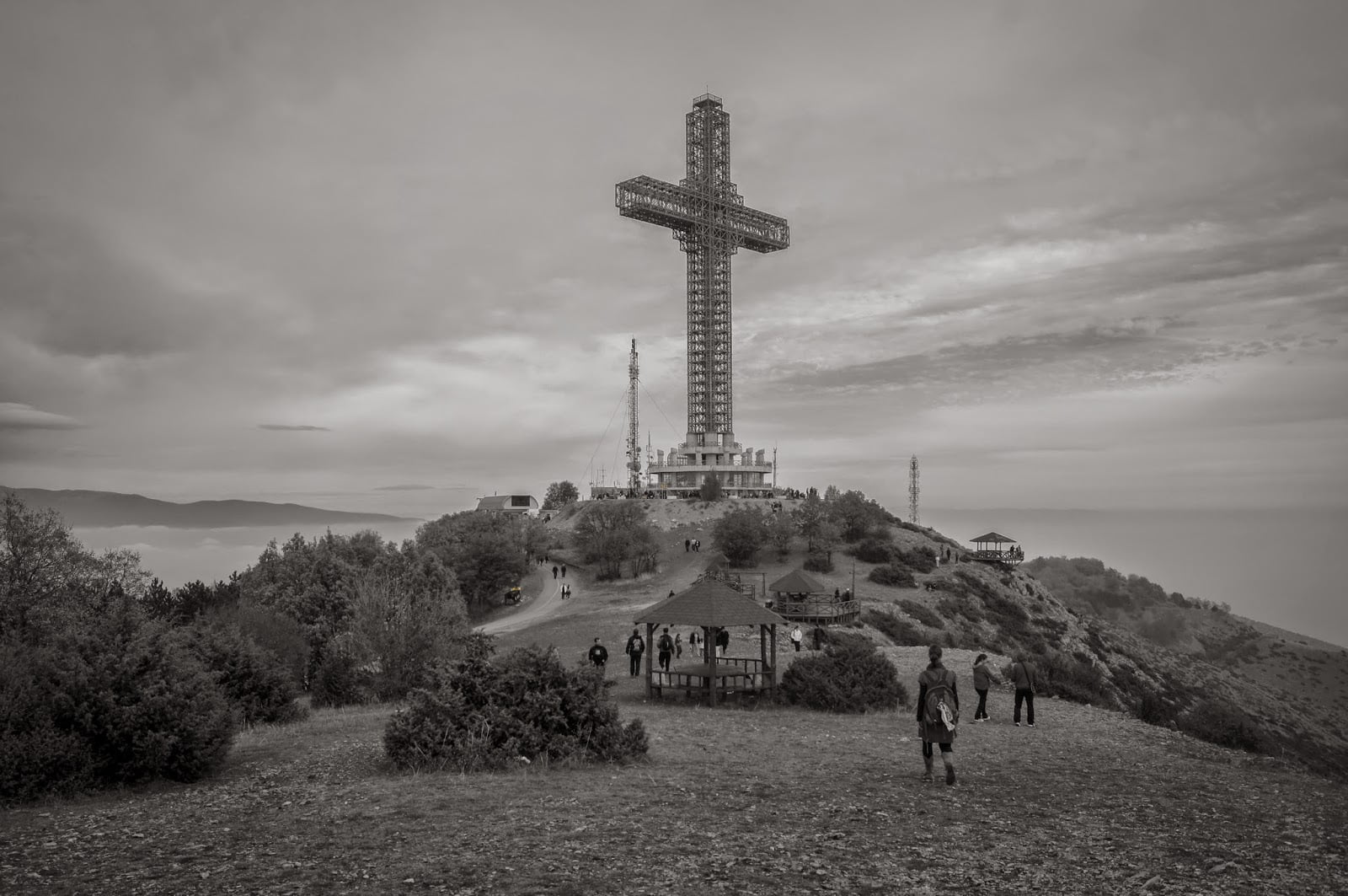 monte Vodno, se puede ver desde la ciudad. Un lugar típico de domingueros, precisamente era domingo así que se esperaba mucha gente por allí haciendo senderismo. Se puede subir a pie pero ya llegamos tardecillo y es una ruta un tanto dura, decidimos subir en el teleférico por poco dinero y bajar a pie. Estaba nublado pero el teleférico iba más alto que las nubes dejándonos una estampa deun mar de nubes preciosa. Anduvimos por toda la zona de la cruz entre macedonios que hacían sus rutas o que hacían picnic con esashermosas vistas de las nubes y de las montañas de alrededor, normalmente se dice que hay unas vistas geniales sobre la ciudad, nos quedamos con las ganas.