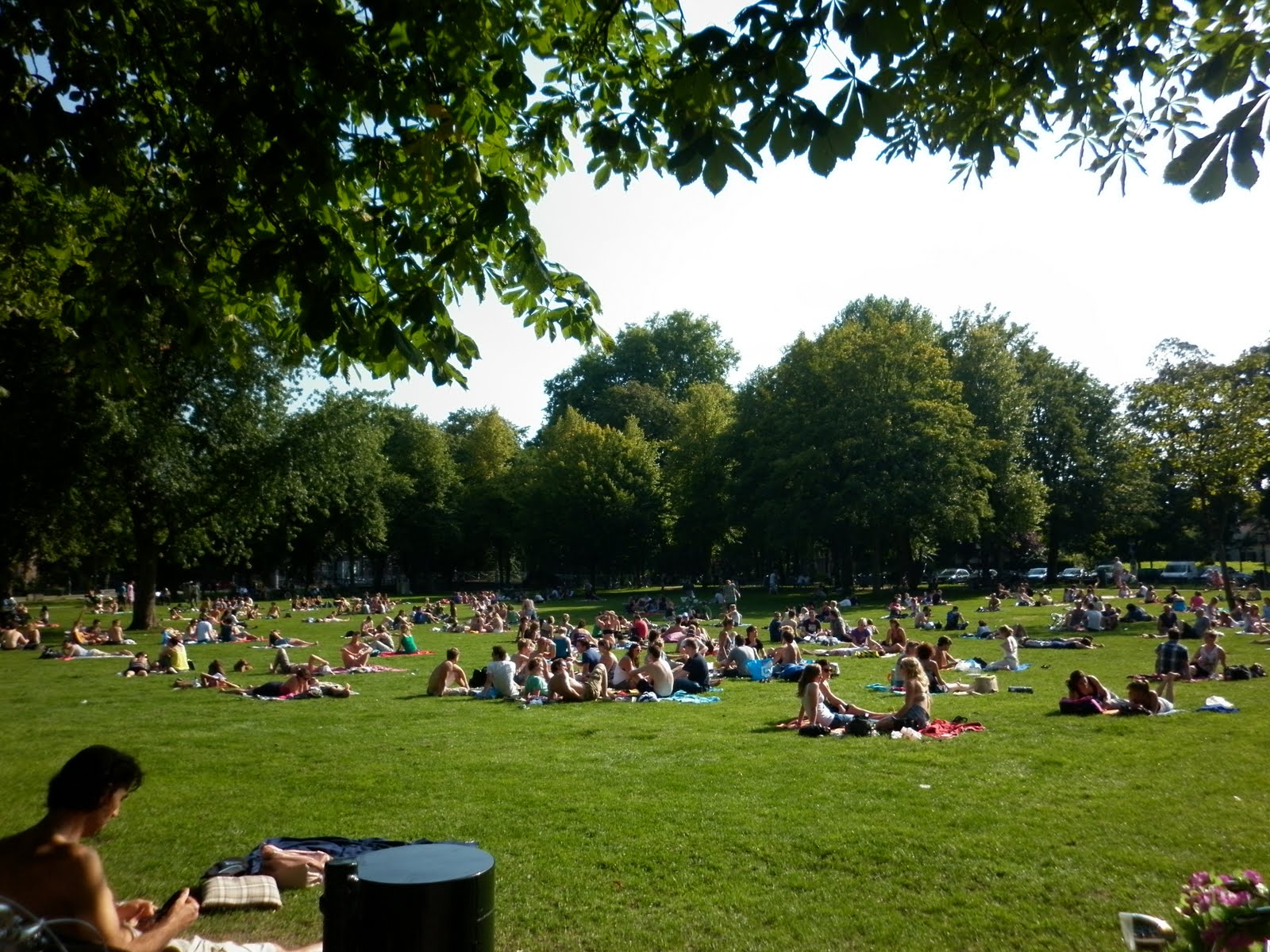 Vimos varias iglesias típicas de los Países Bajos bastante llamativas y mucho parque y verde por el camino, todo muy bien cuidado y agradable para pasear sobre todo por el buen tiempo que estaba haciendo. La gente abarrotaba los parques cual playa de Benidorm un 10 de agosto.